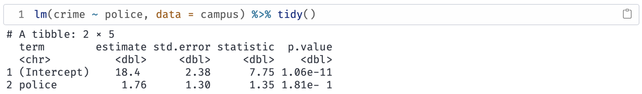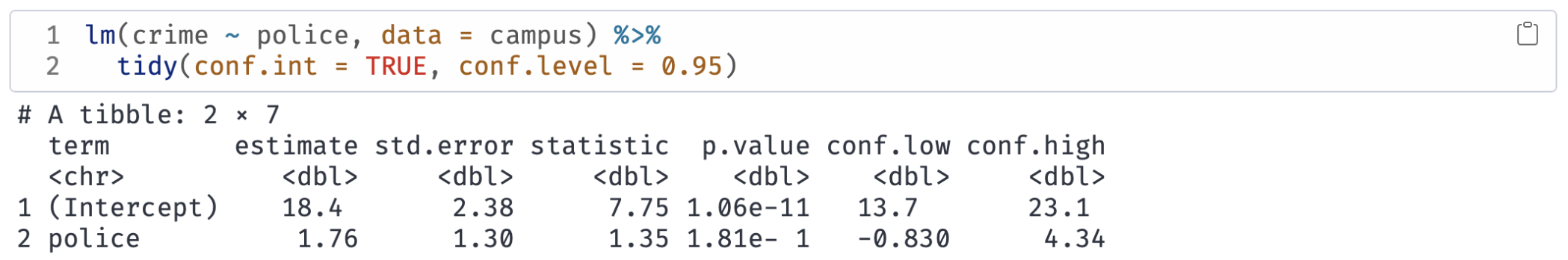 You can instruct tidy to return a 95 percent confidence interval for the association of campus police with campus crime: