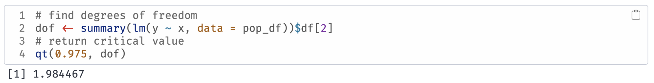 Notation: \(t_{1-\alpha/2, n-2}\) or \(t_\text{crit}\).