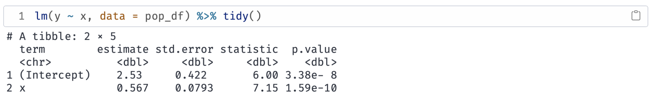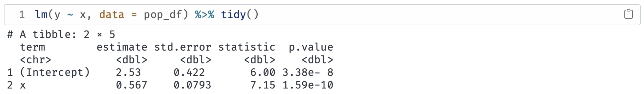 Notice that the \(\color{#434C5E}{t}\)-statistic is 7.15. The critical value is \(\color{#434C5E}{t_{\text{0.975, 28}}} = 2.05\).