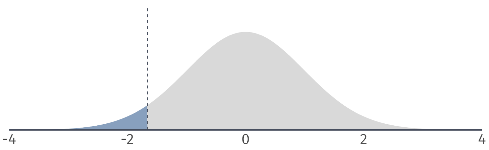 Left-tailed: Based on a critical value of \(t_{1-\alpha, n-2} = t_{0.95, 100} = 1.66\), we can identify a rejection region on the \(t\)-distribution.