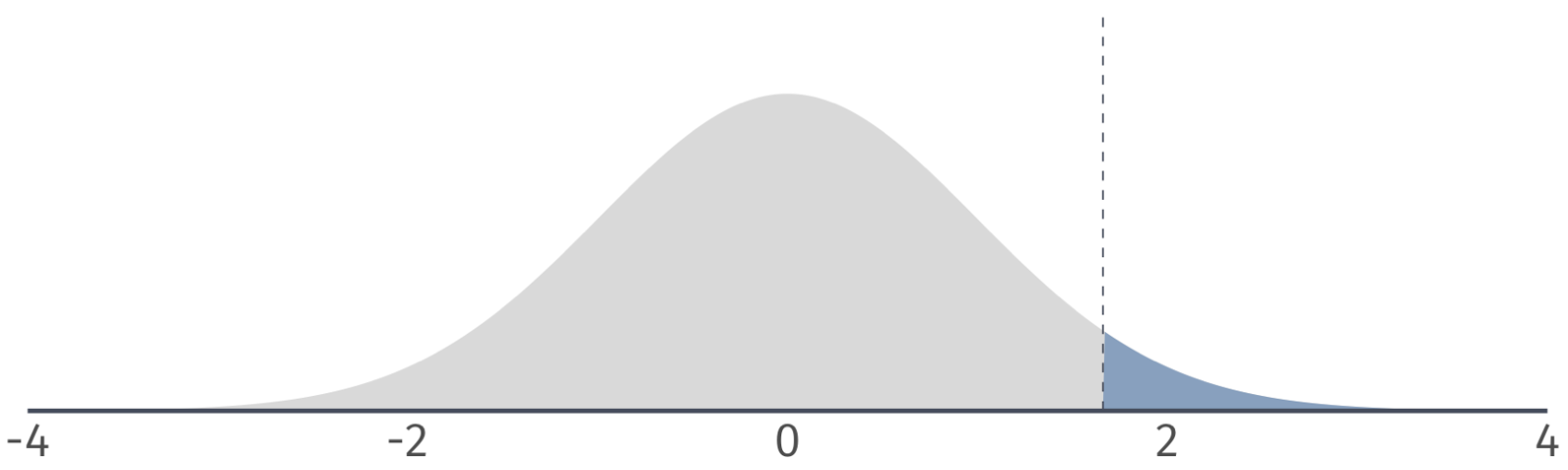 Right-tailed: Based on a critical value of \(t_{1-\alpha, n-2} = t_{0.95, 100} = 1.66\), we can identify a rejection region on the \(t\)-distribution.