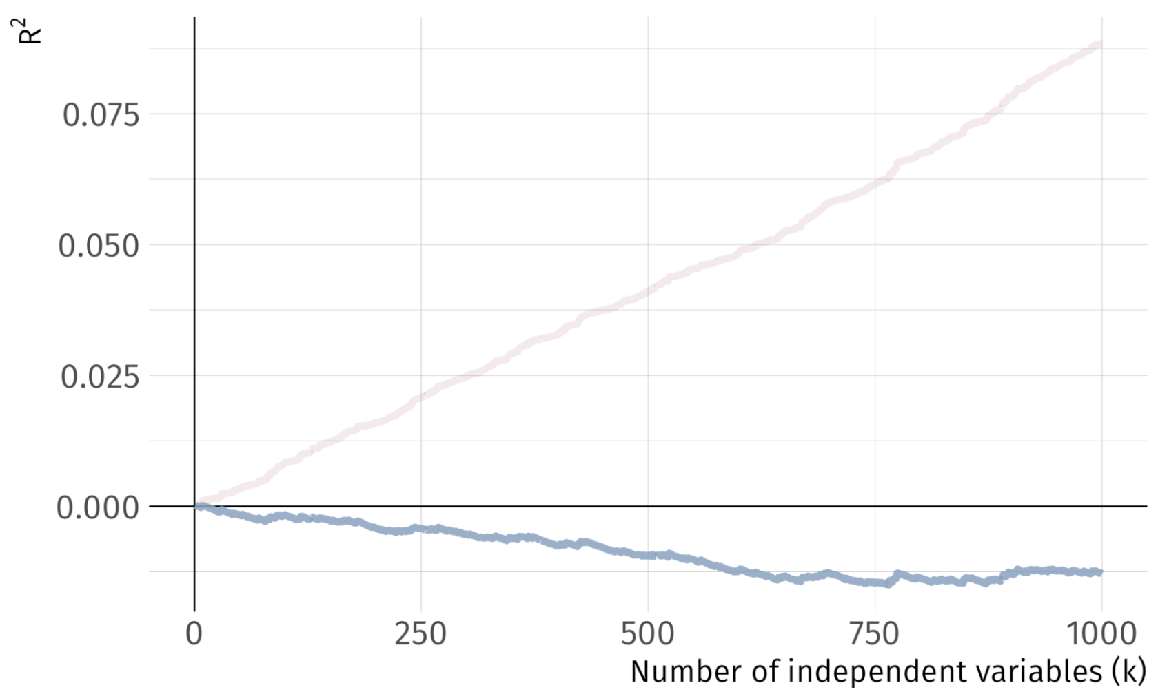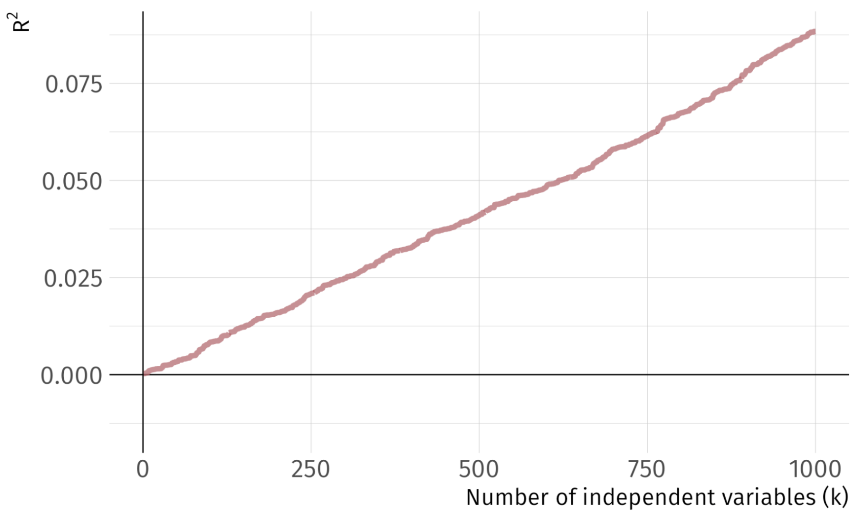 We have 1,000 independent variables that are independent to the dependent variable. Each \(x_k\) has no relationship to \(y\) whatsoever.