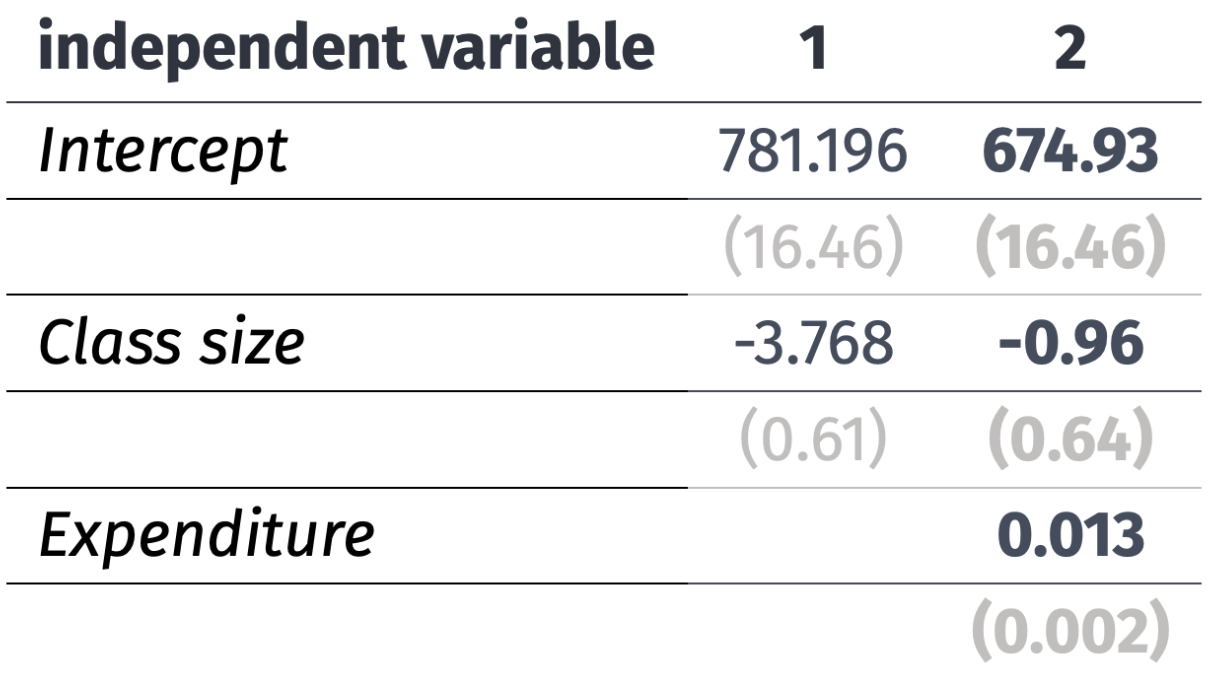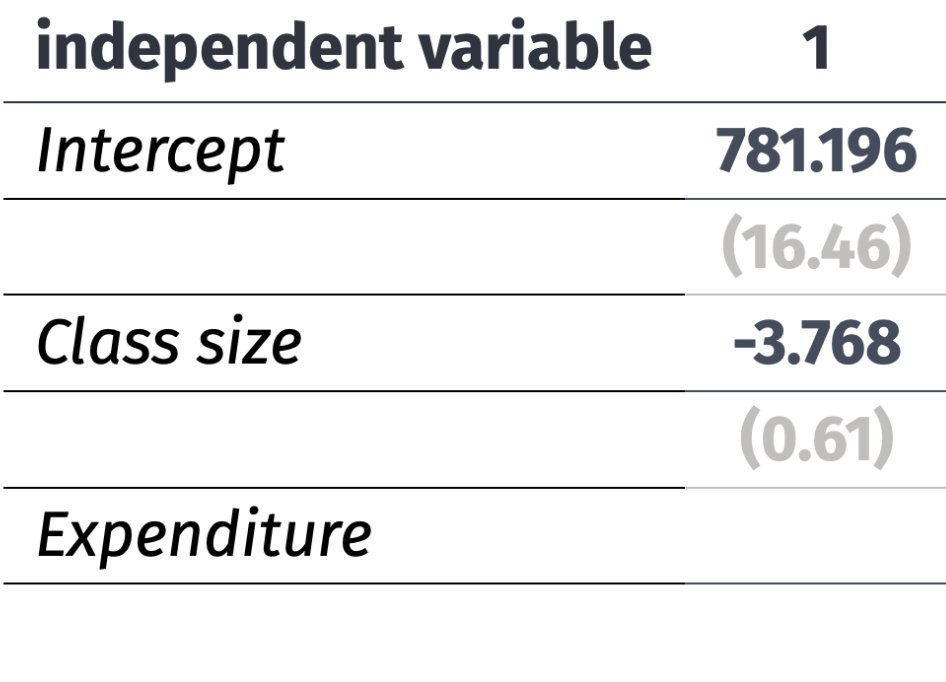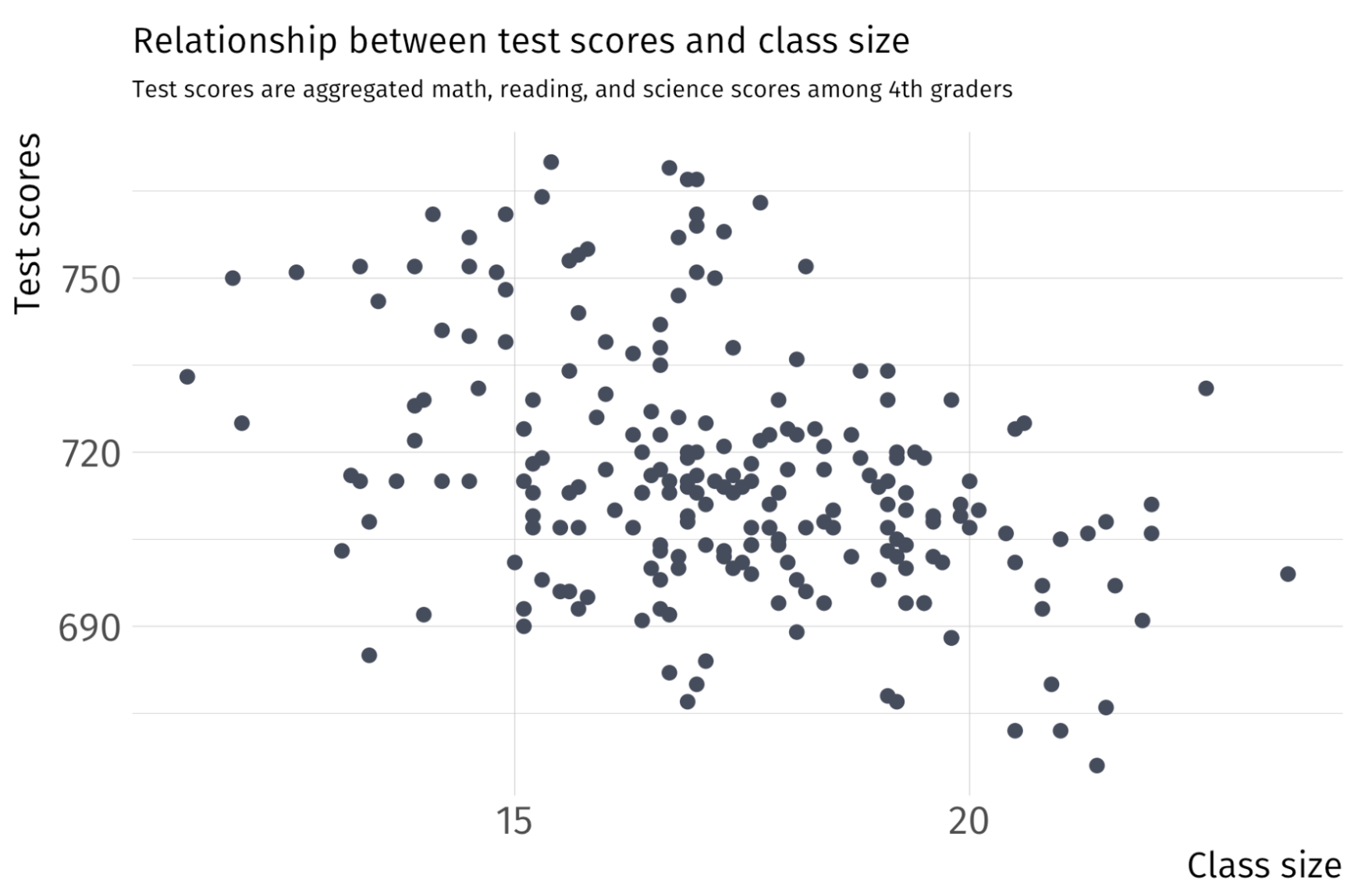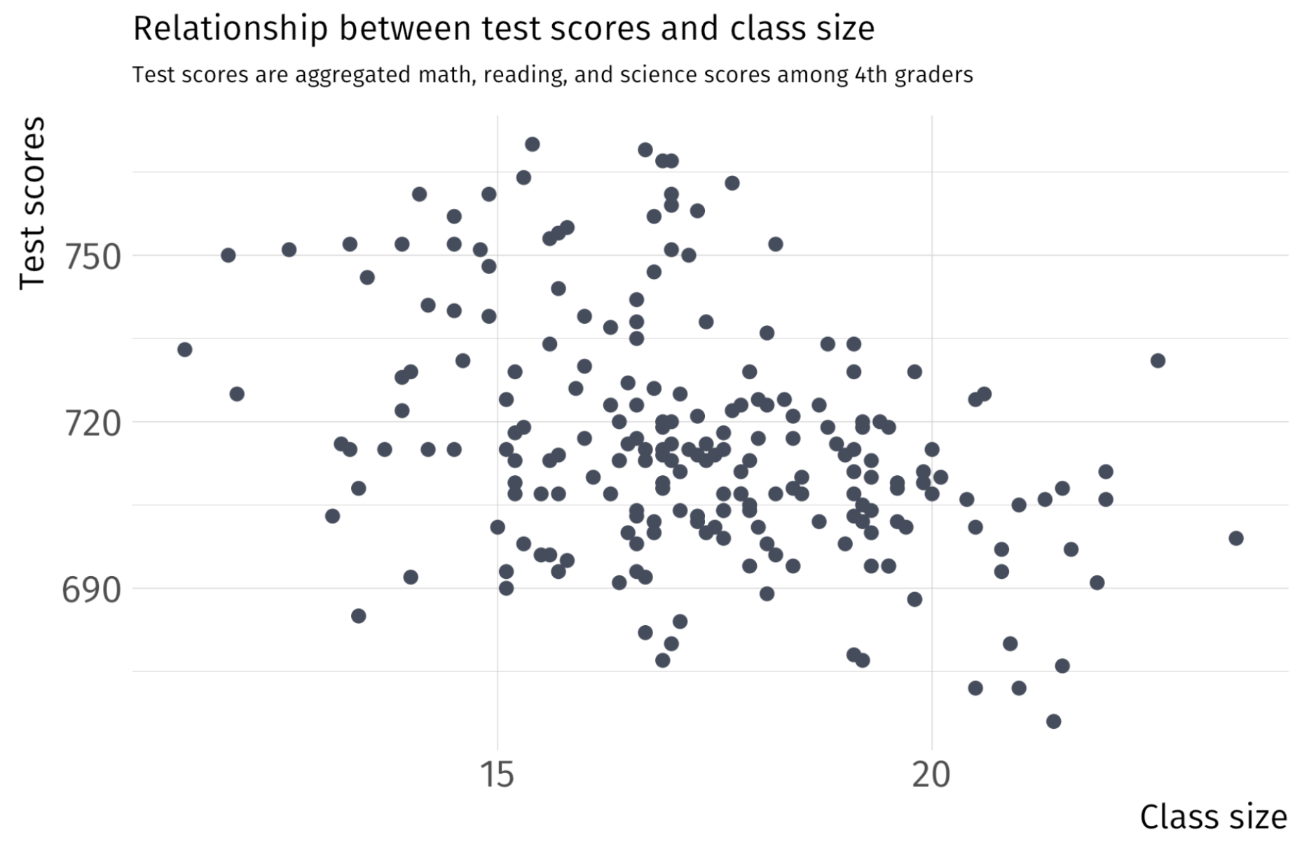 \[ \text{Scores}_i = \beta_0 + \beta_1 \text{Class Size}_i + u_i \]