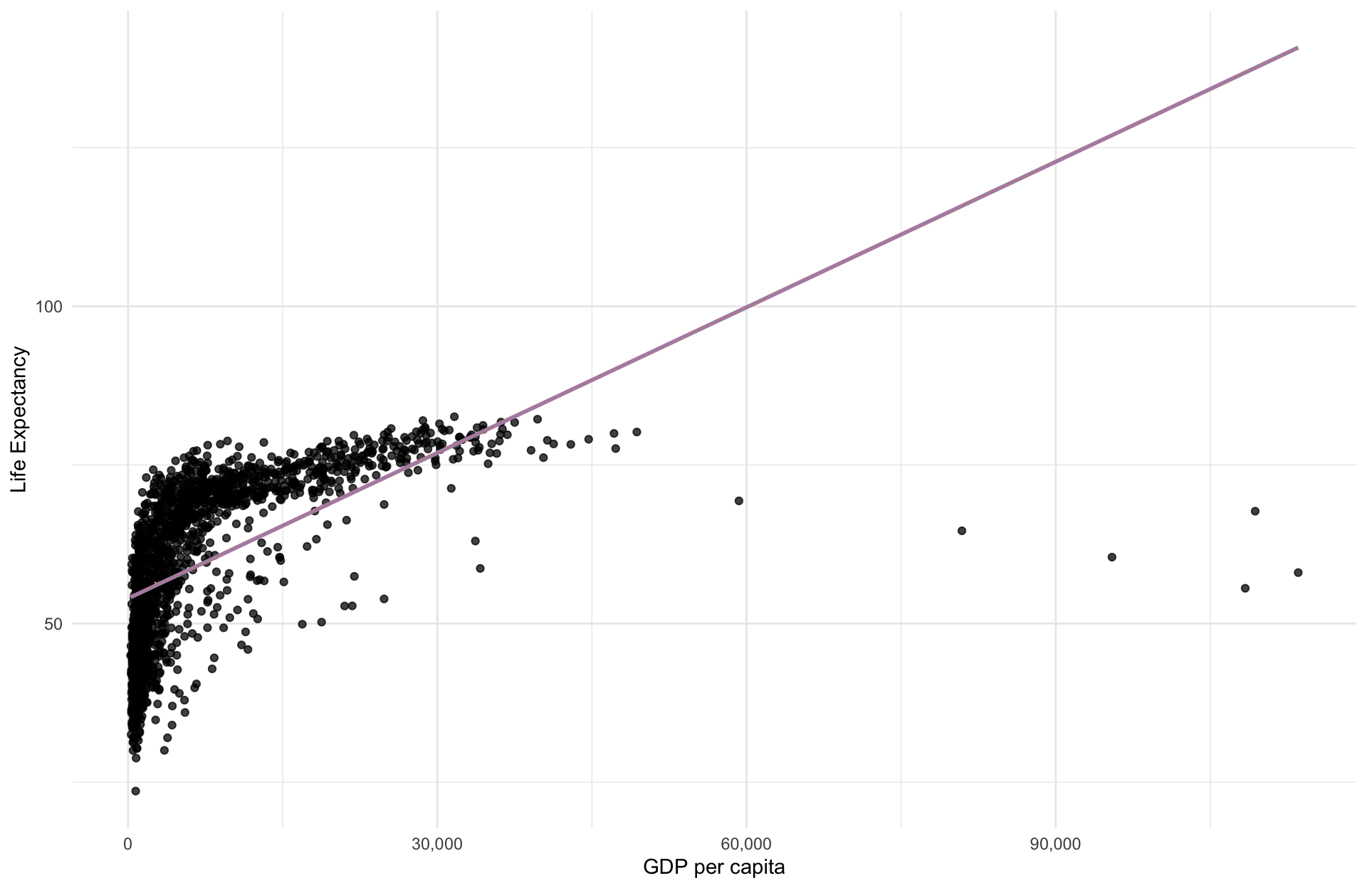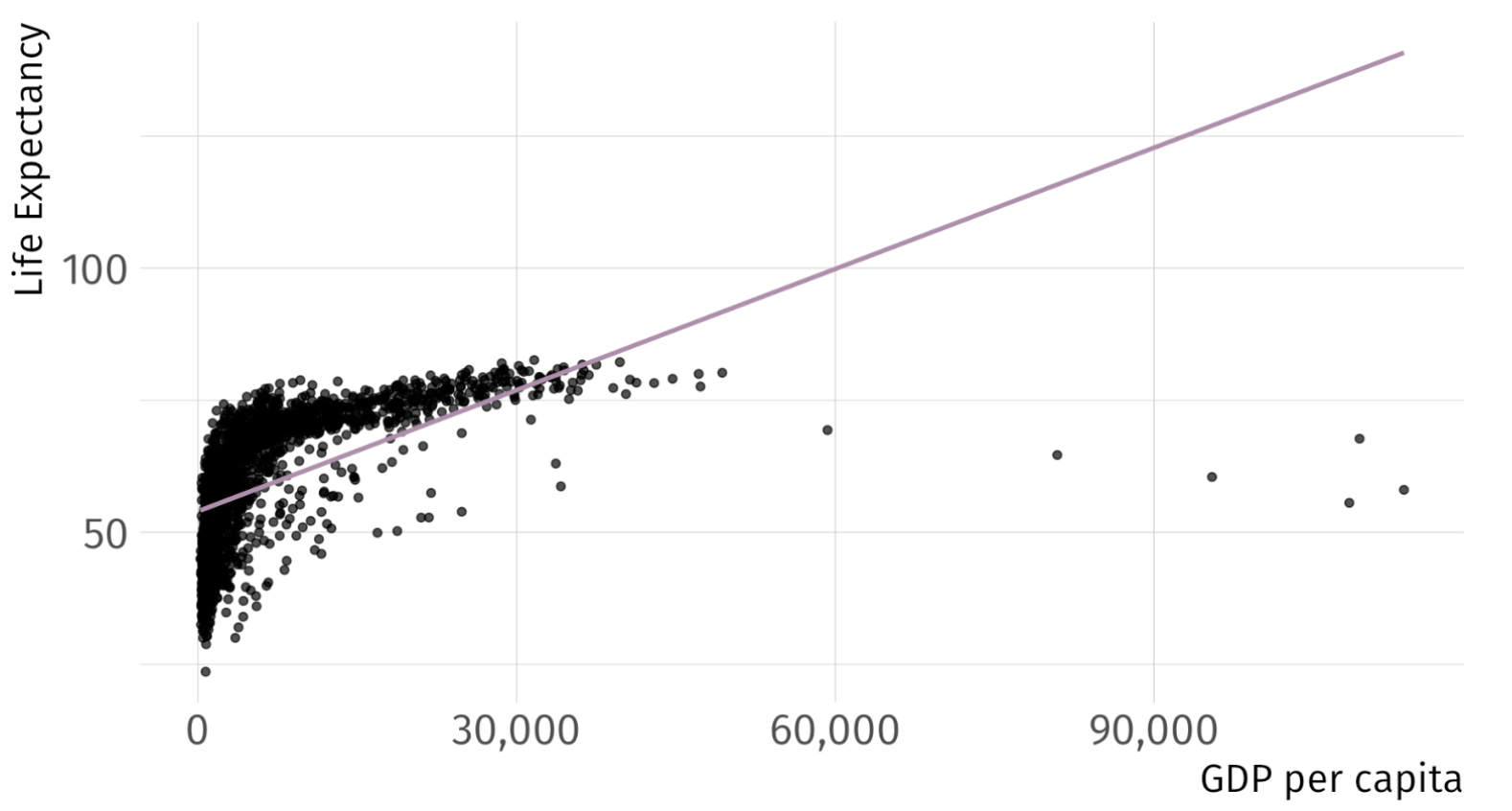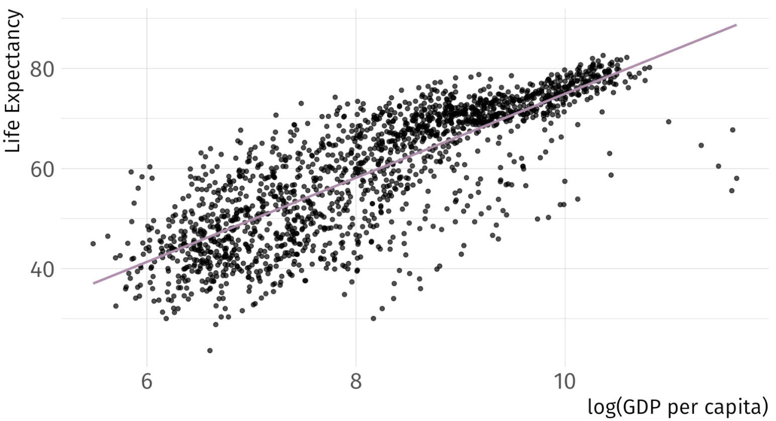 \[ {\text{Life Expectancy}_i} = \beta_0 + \beta_1 \text{GDP}_i + u_i \]