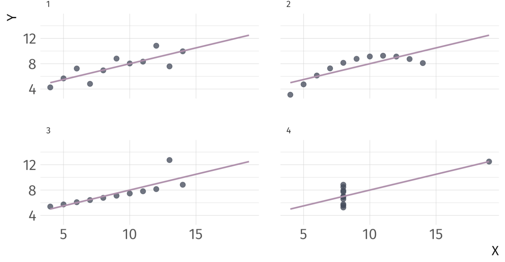 Four “identical” regressions: Intercept \(= 3\), Slope \(= 0.5\), \(R^{2} = 0.67\)
