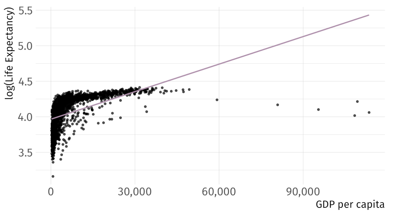 \[ log(\widehat{\text{Life Expectancy})_i} = 3.97 + 1.3 \times 10^{-5} \cdot \text{GDP}_i \quad\quad R^2 = 0.3 \]
