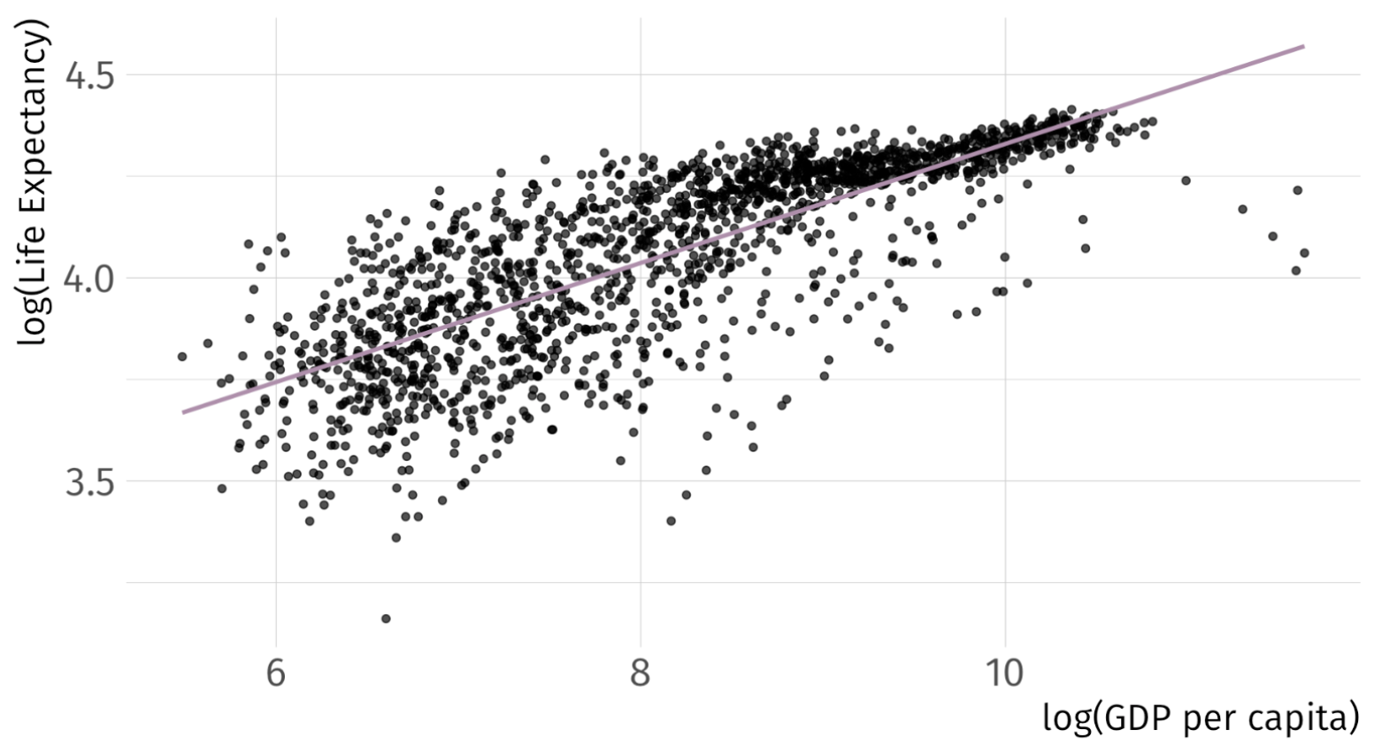 \[ log(\widehat{\text{Life Expectancy})_i} = 2.86 + 0.15 \cdot log(\text{GDP}_i) \quad\quad R^2 = 0.61 \]