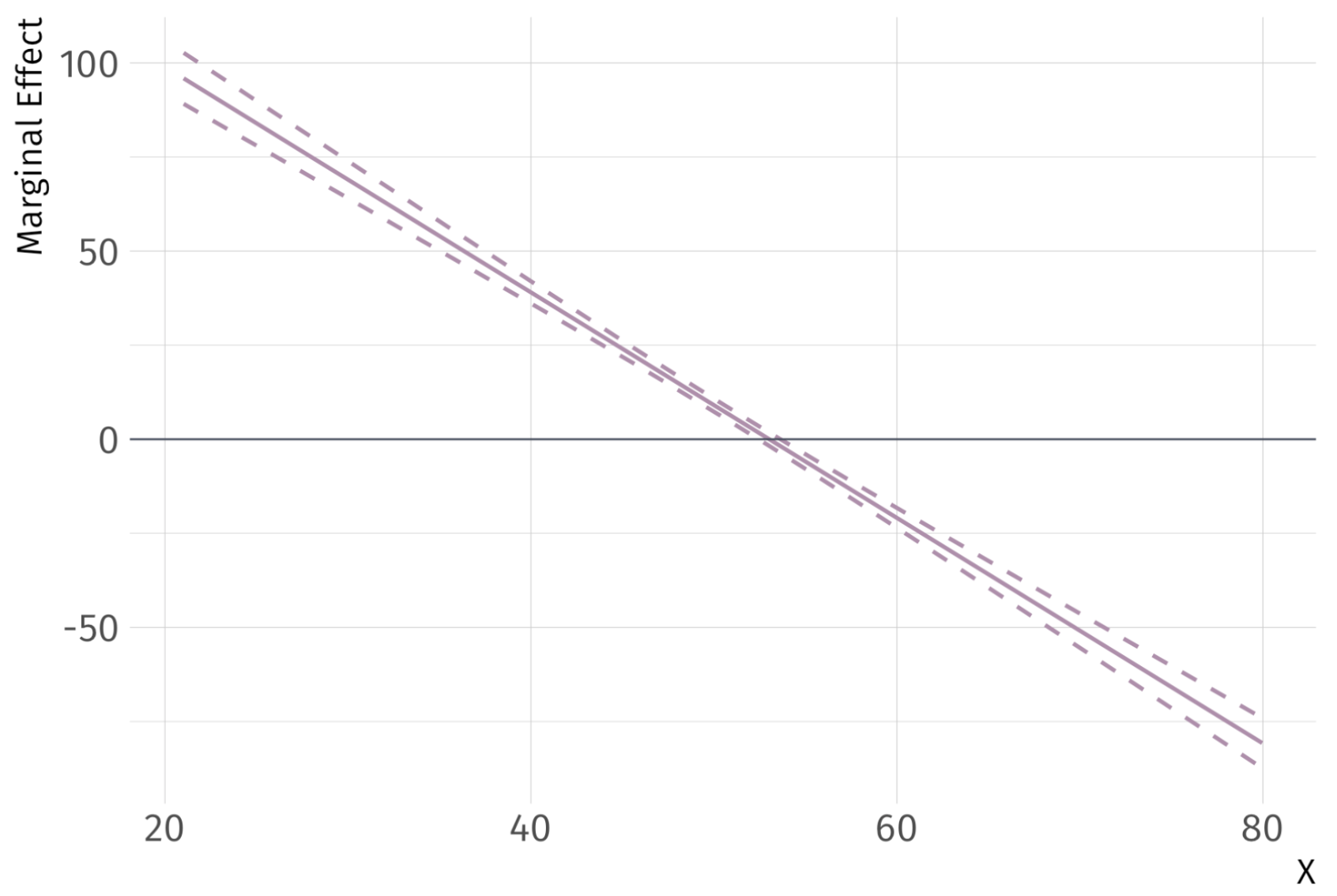 \[ \color{#B48EAD}{\dfrac{\partial Y}{\partial X} = \beta_1 + 2 \beta_2 X} \]