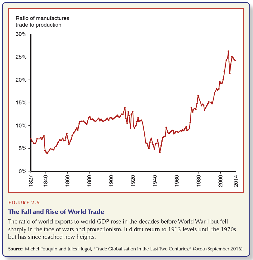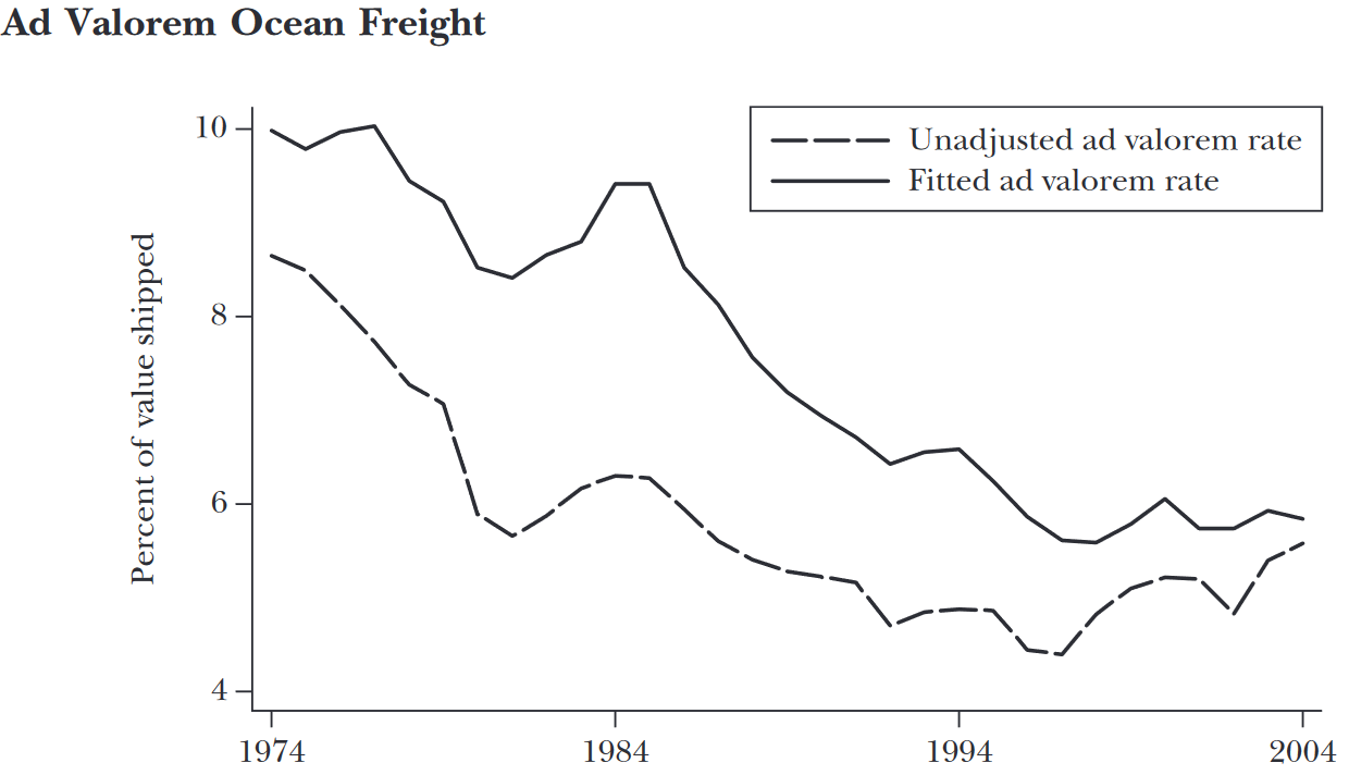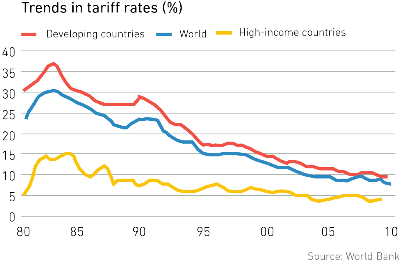 Explicit trade barriers have fallen over time, coinciding with the growth of trade relative to economic activity