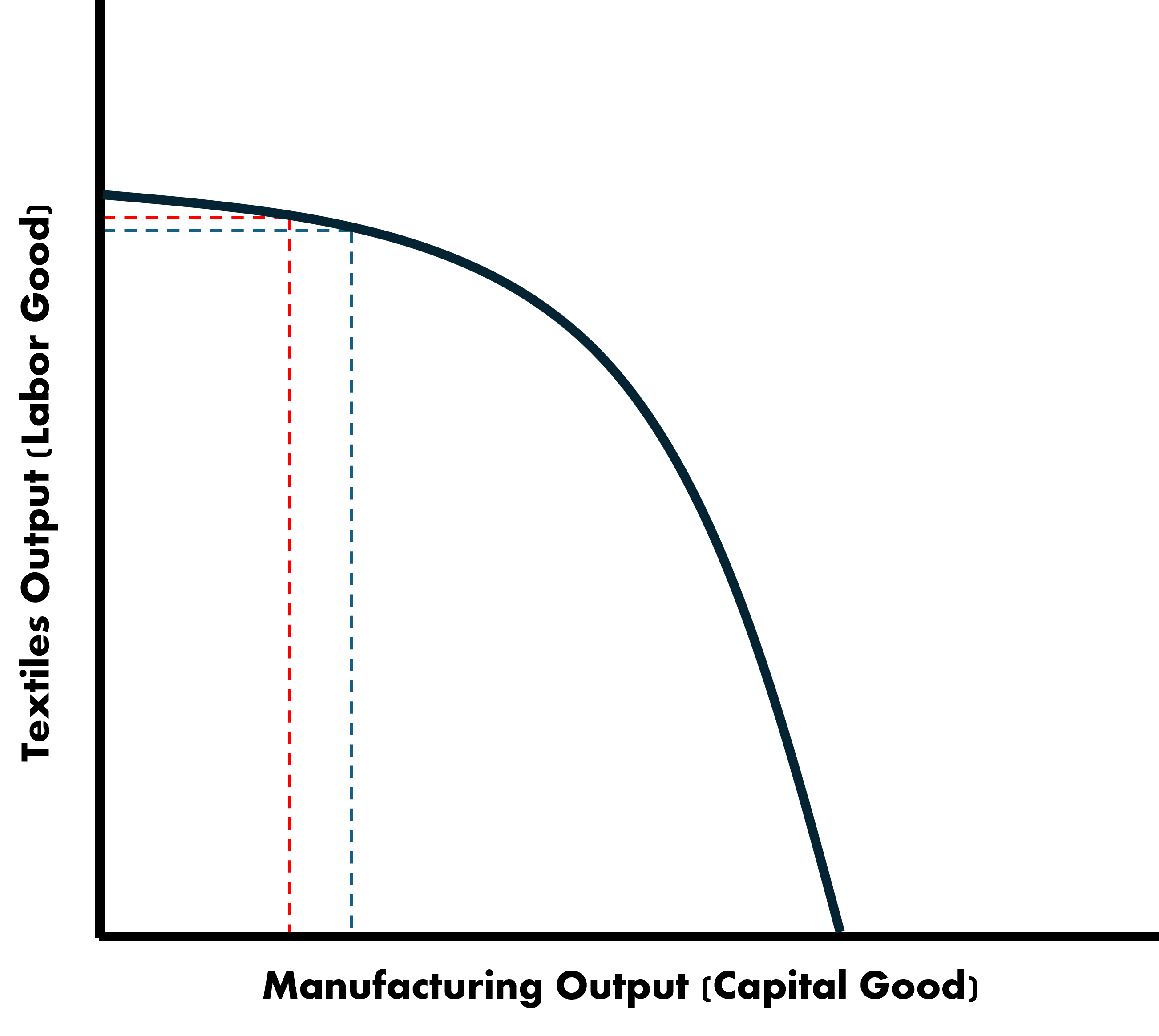 As you reallocate resources from a capital-intensive good to a labor-intensive, you need greater amounts of factors due to factor combinations being misaligned