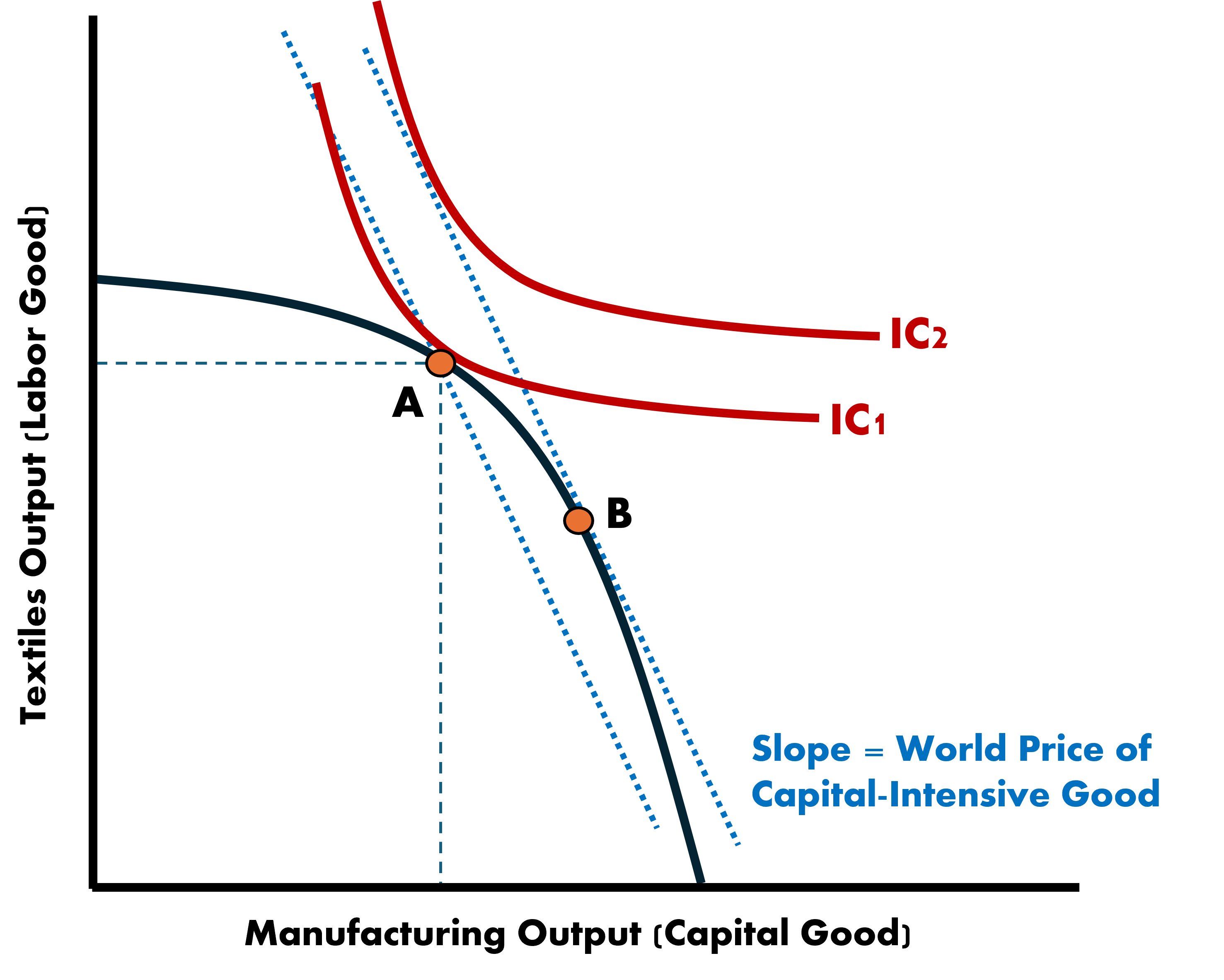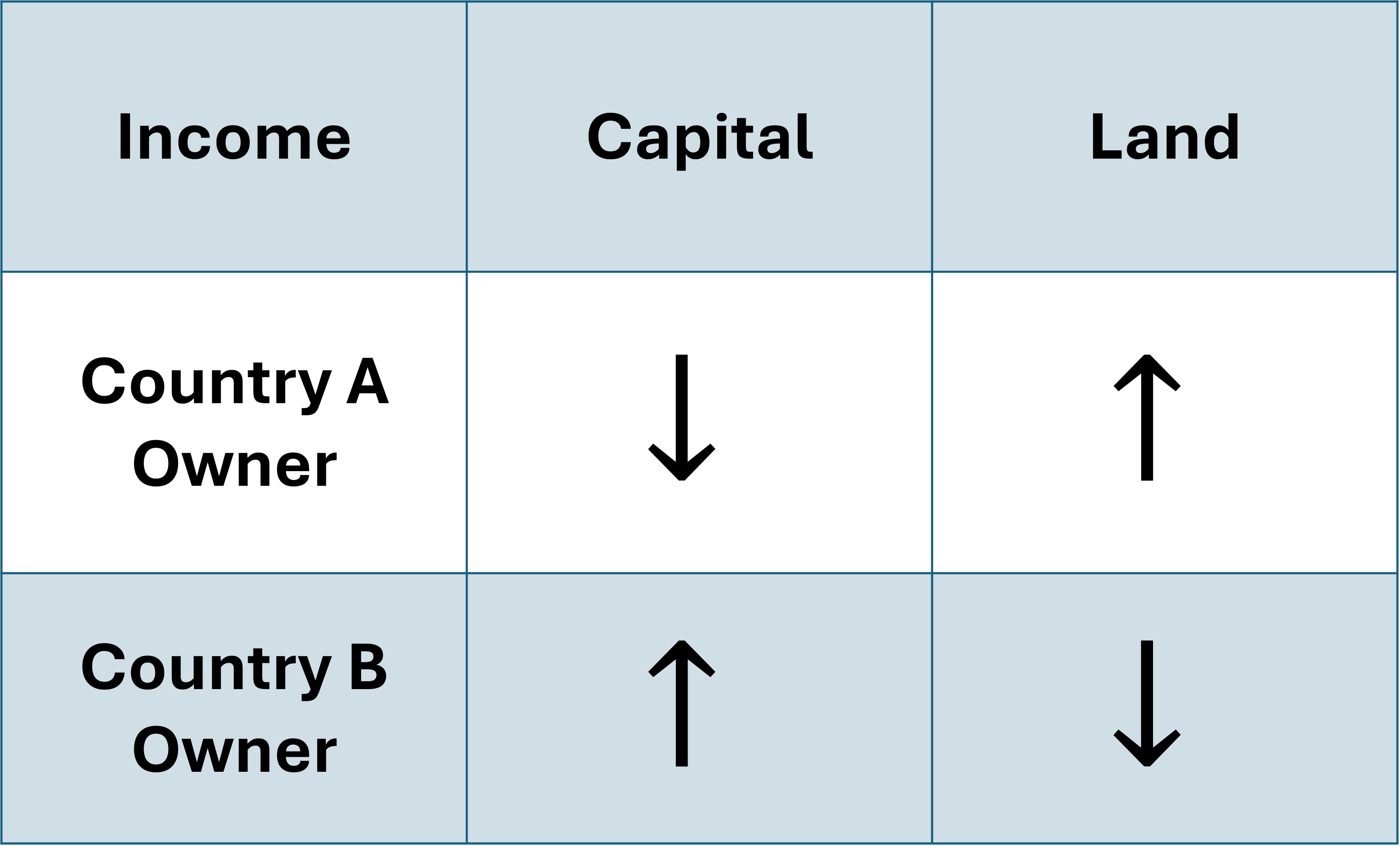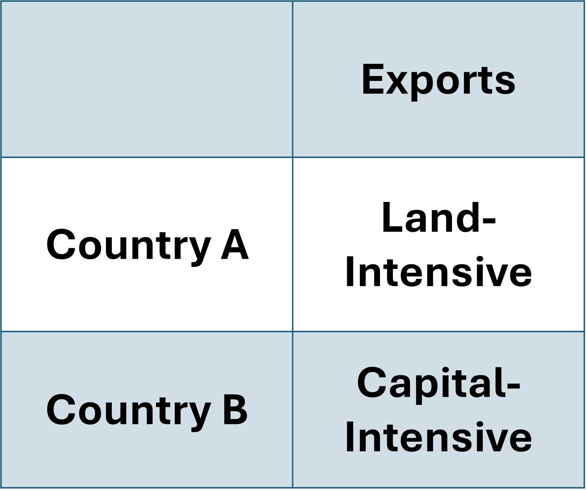 Let’s say that Country A is relatively well endowed with land and Country B is relatively well endowed with capital