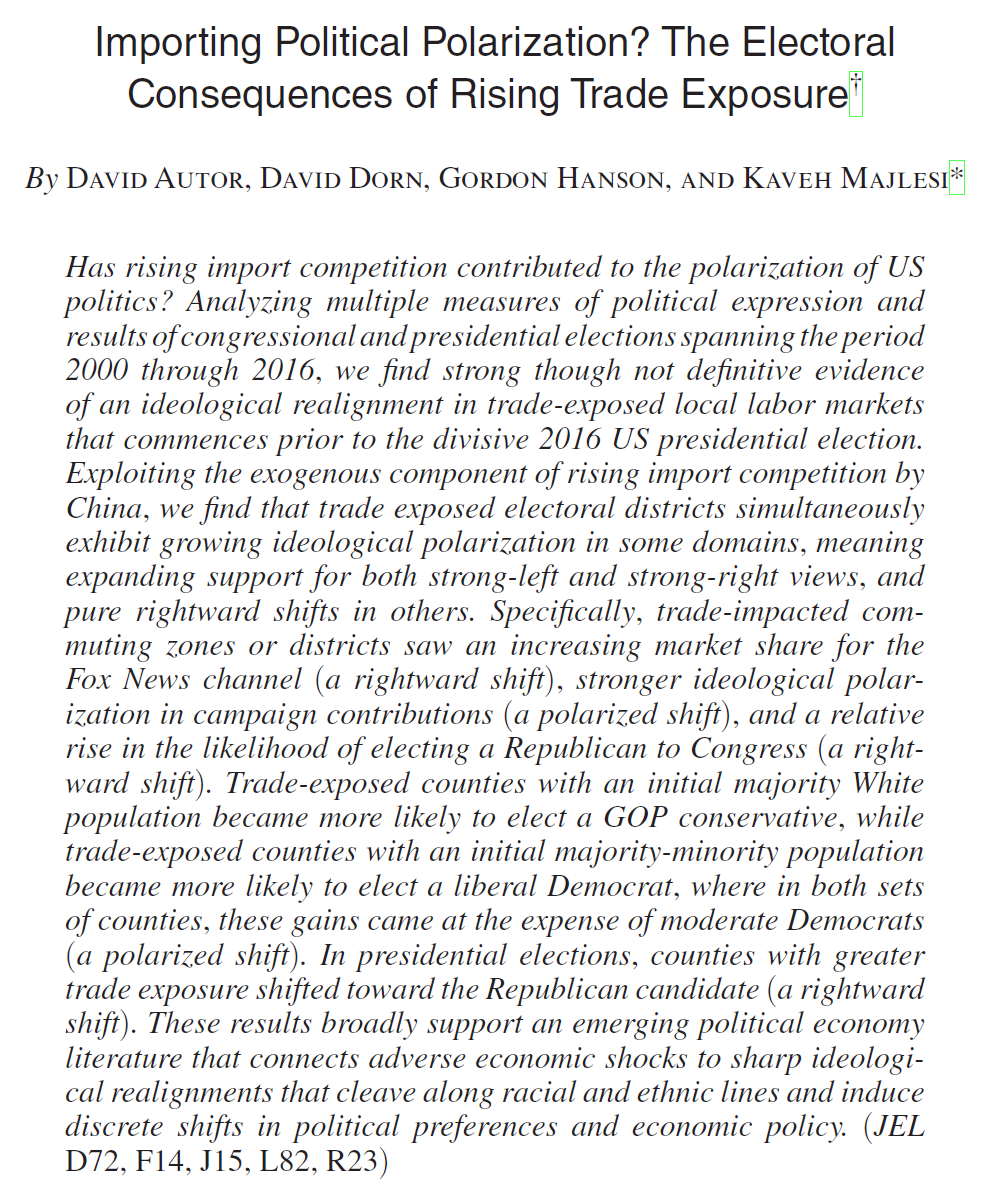 Let me introduce some political science concepts to motivate possible political shifts due to trade