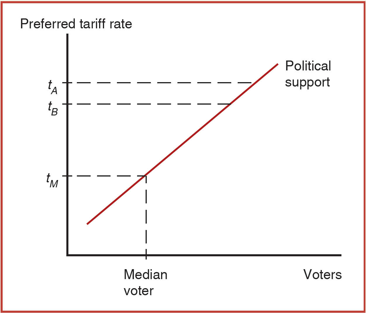 If we think about lining up all the voters in the order of the tariff rate they prefer, with the voters who favor the lowest rate on the left and those who favor the highest rate on the right we get: