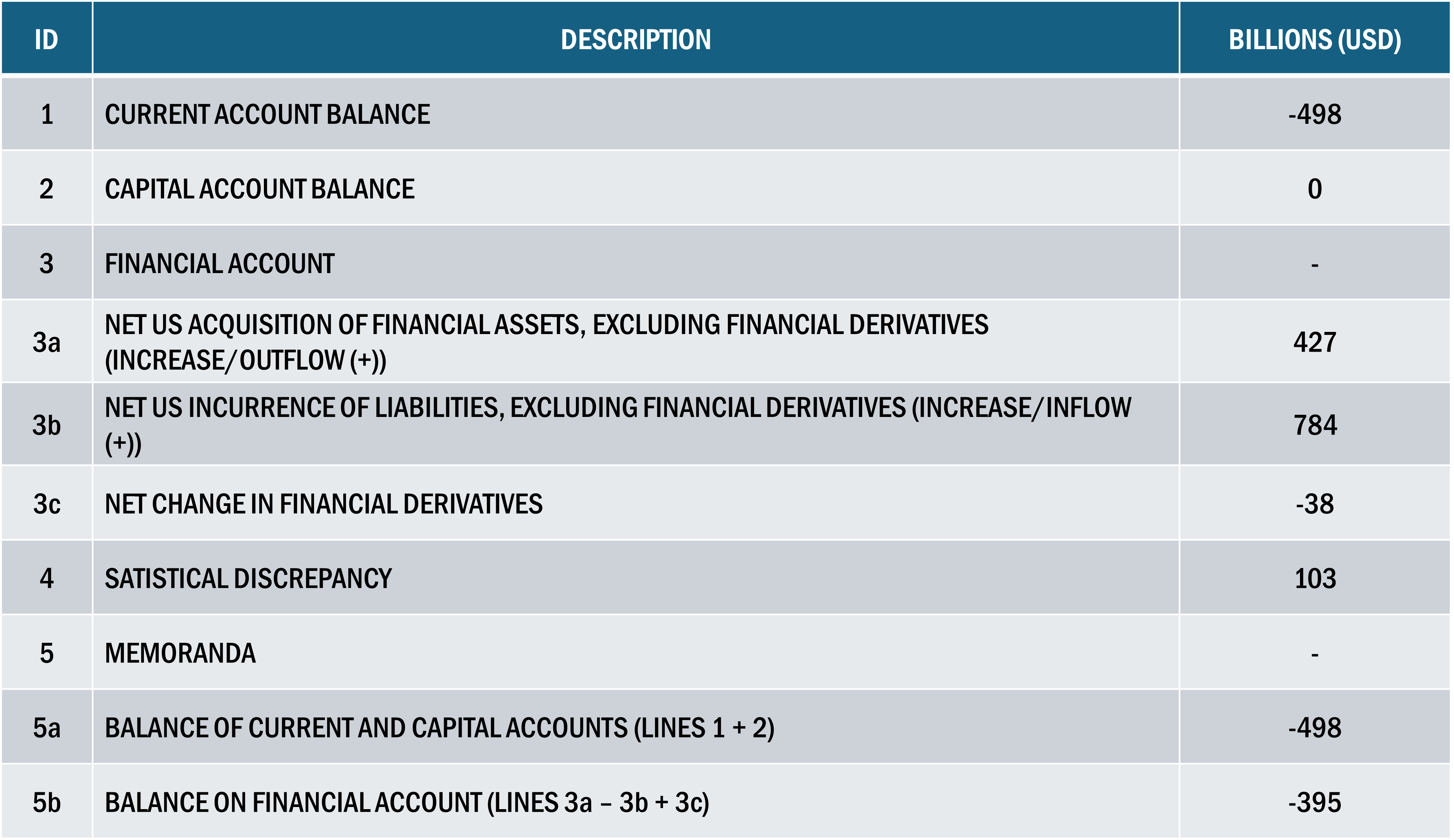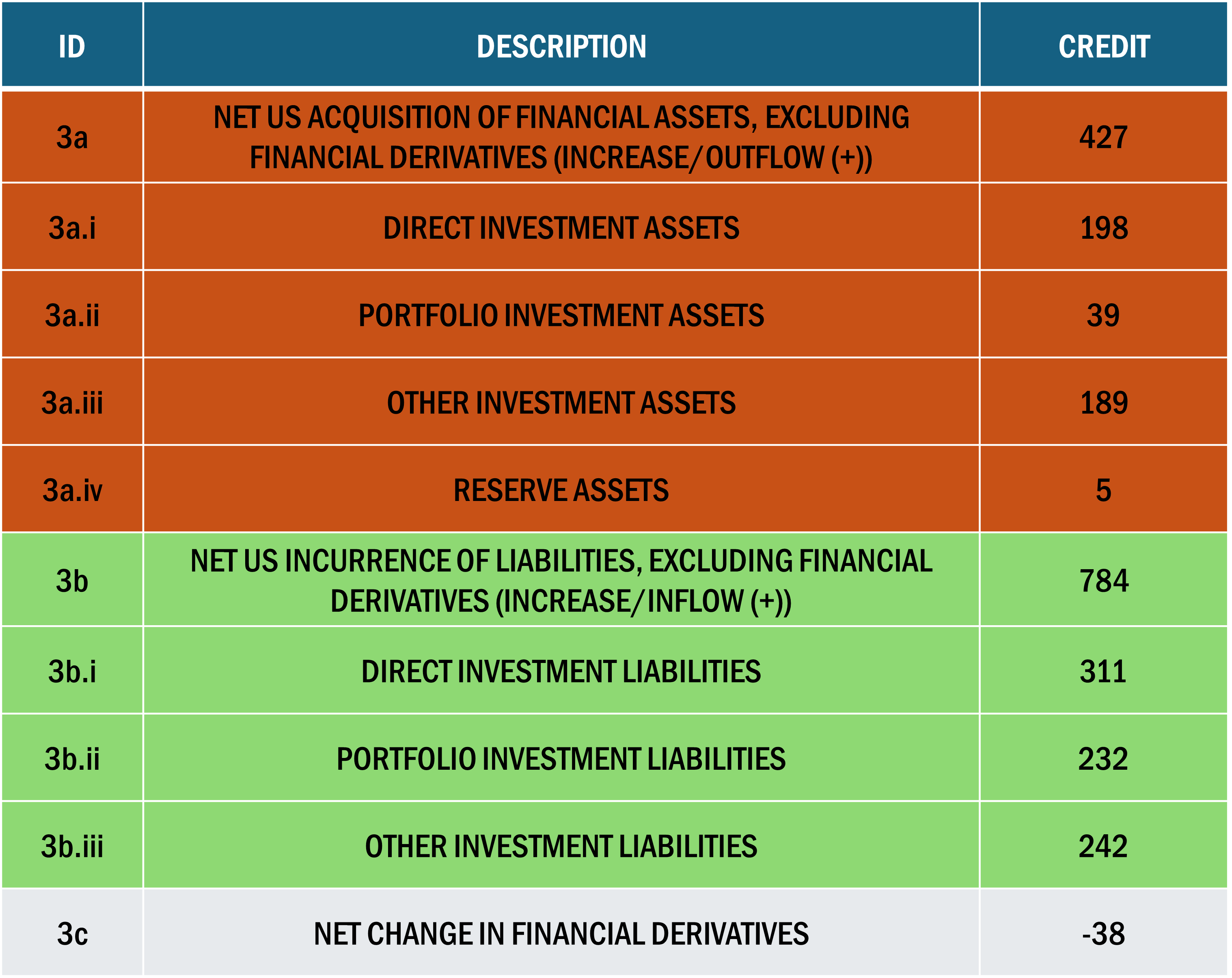 \[\begin{align*} \text{Financial Account } &= \text{Net Acq. of Assets } - \text{Net Inc. of Liabilities} + \text{Net Change in Derivatives} \\ \text{Financial Account } &= 427 - 784 + (-38) = -395 \text{ billion} \end{align*}\]