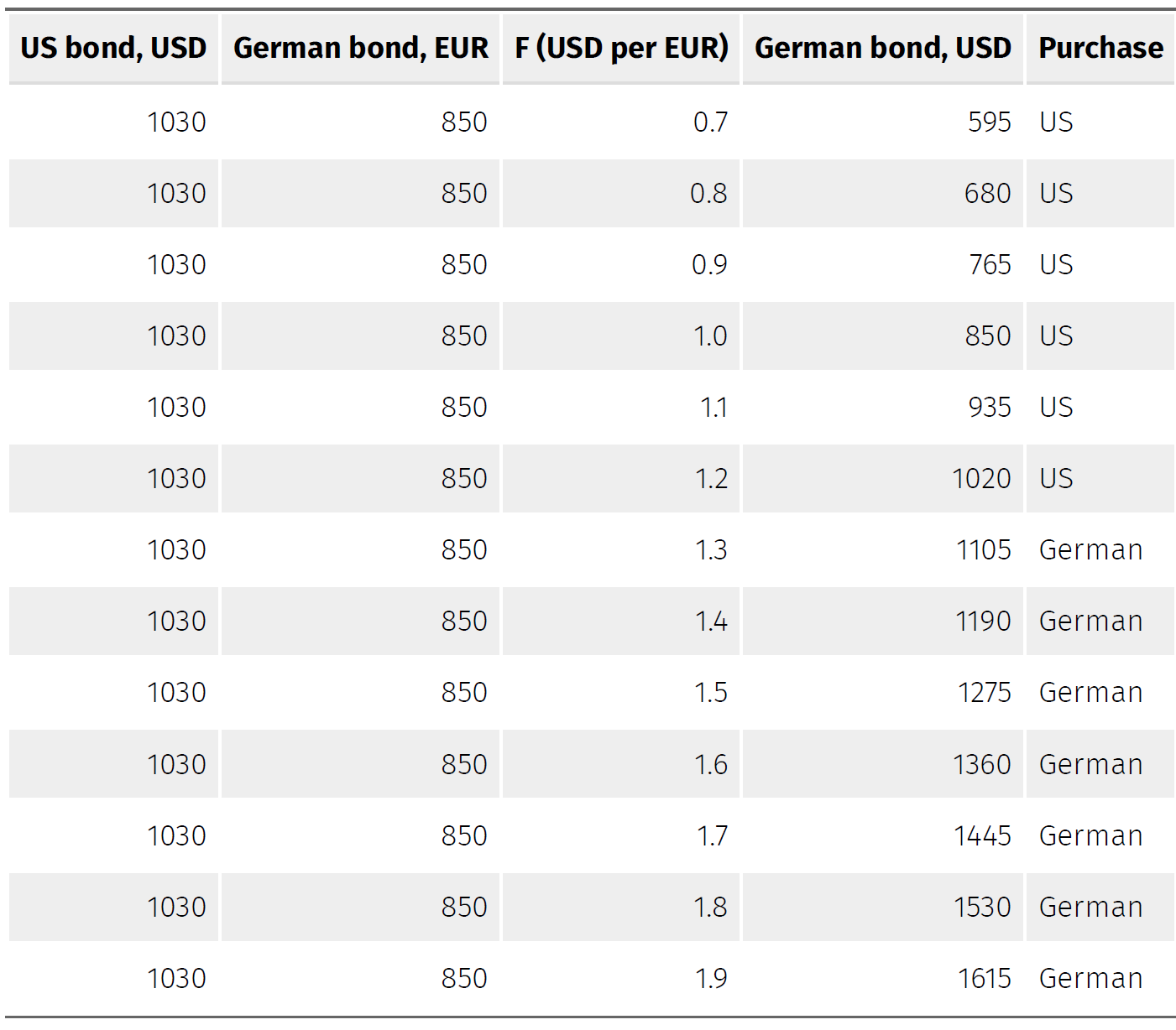 Suppose an investor is weighing the choice between a 1-year US bond and a 1-year German bond