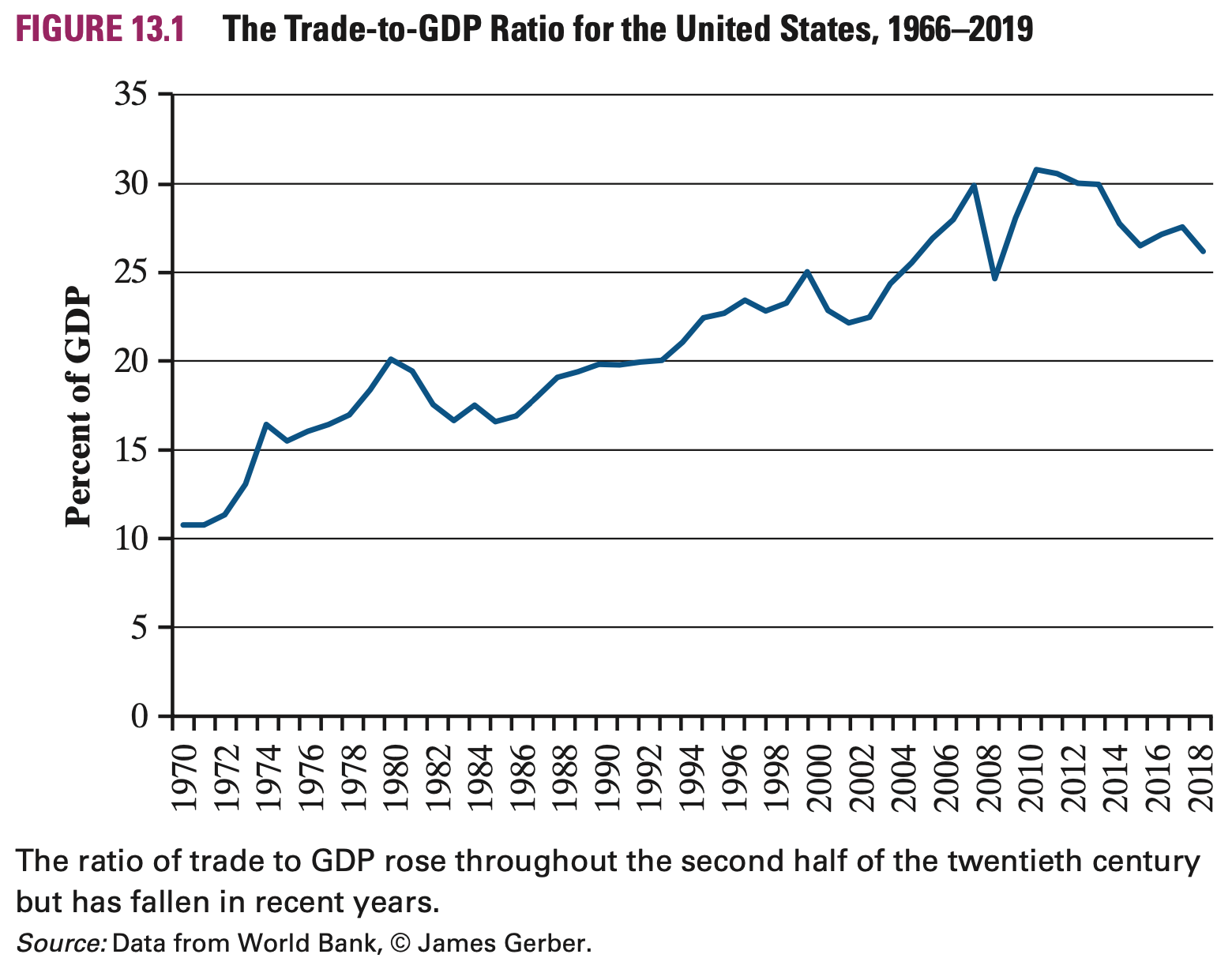Although trade represents a small share of GDP, there has been an upward trend in this ratio