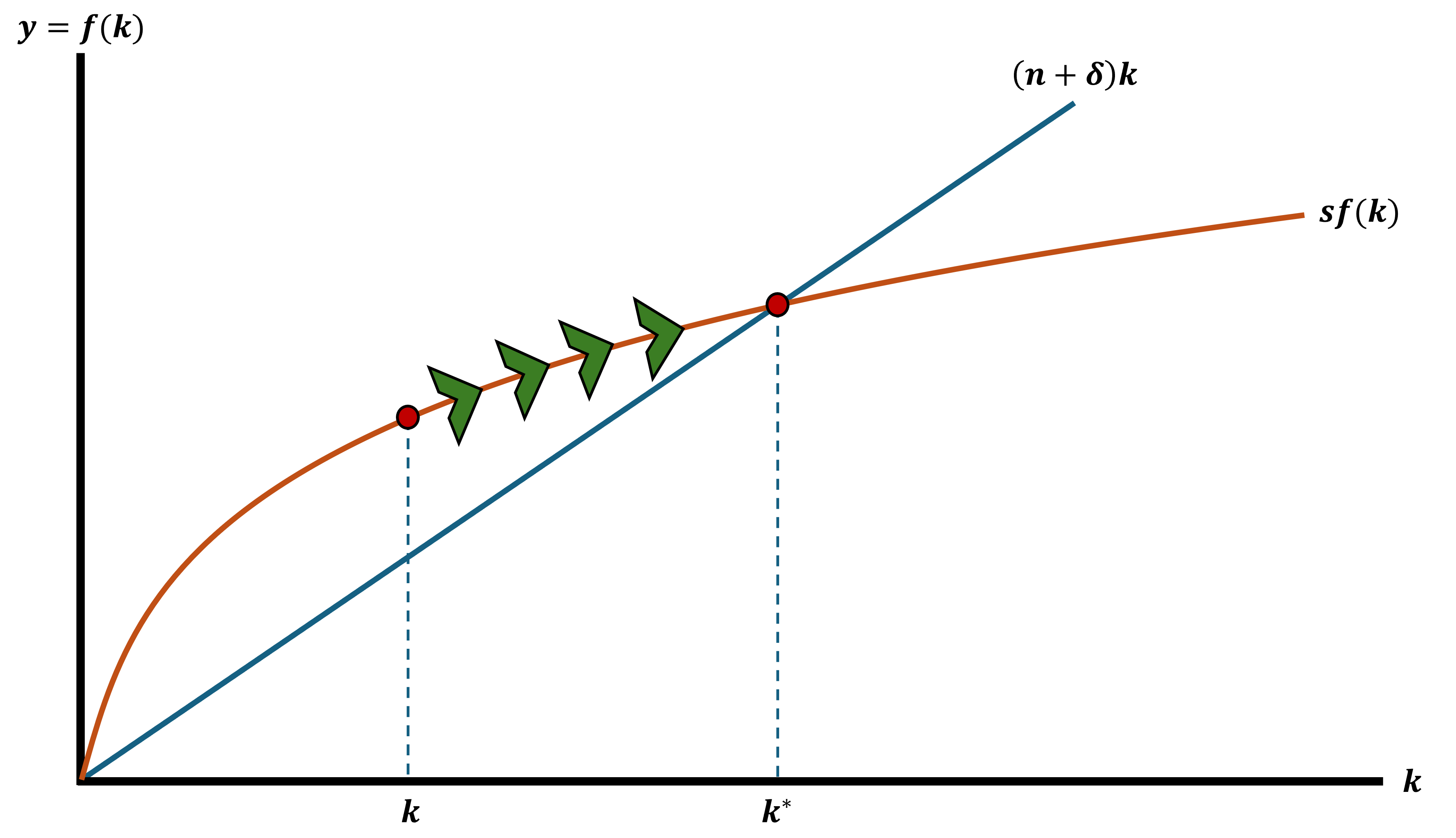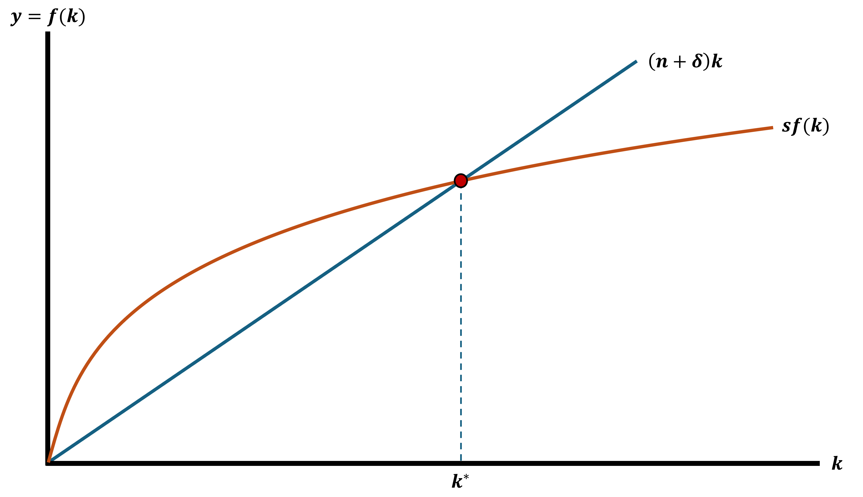 \[ \Delta k = 0 = sf(k^{*}) - (n + \delta)k^{*} \\ sf(k^{*}) = (n + \delta)k^{*} \]