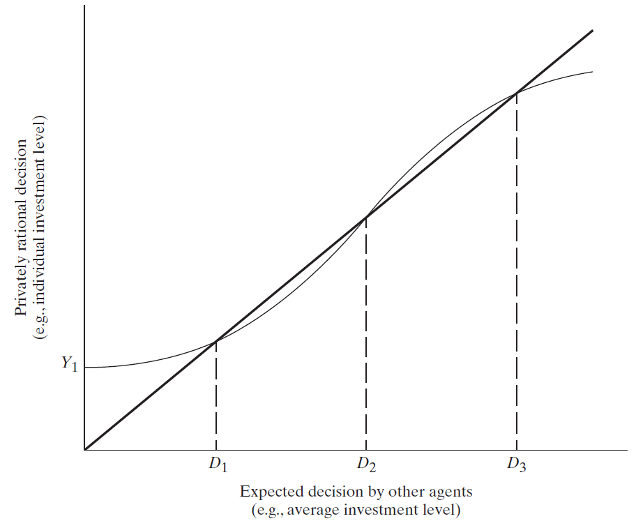 Movement to a better equilibrium can be especially difficult when there are many agents to consider
