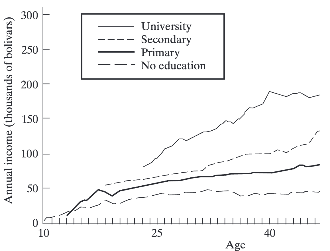 Formally, we can write the Discounted Value of Education where \(E\) is income with extra education, \(N\) is income without extra education, \(t\) is year, \(i\) is the discount rate and this is summed over expected years of working life: